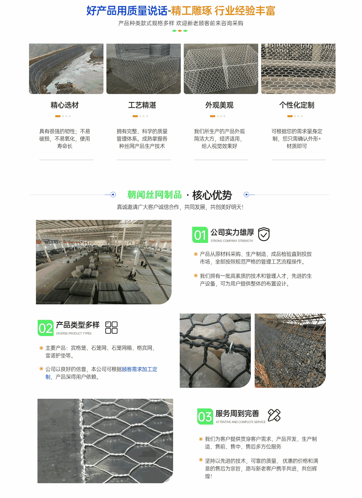 深州市朝聞絲網(wǎng)制品有限公司擁有“中國絲網(wǎng)之鄉(xiāng)”美譽的河北省致力于生產(chǎn)銷售格賓網(wǎng),雷諾護墊,景觀石籠網(wǎng),邊坡防護網(wǎng),綠濱墊,固濱籠的廠家,規(guī)格多種多樣。 我廠堅持技術創(chuàng)新、科學管理、誠信經(jīng)營,注重引進新型生產(chǎn)技術設備,推行標準化生產(chǎn),采用質量管理體系,從原材料采購、生產(chǎn)管理、產(chǎn)品檢測等關鍵環(huán)節(jié)嚴格把關,確保了產(chǎn)品質量,贏得了客戶的信賴。我公司秉承“誠信、務實、高效”的企業(yè)宗旨,真誠希望與世界各地客戶互惠互利,共創(chuàng)美好未來!多年來"以誠立廠","以質興業(yè)"。 憑借過硬的質量、良好的信譽、優(yōu)質的服務、合理的價格不斷拓展市場,誠摯的希望在平等互利,坦誠相待的基礎上與國內外客戶長期合作!...